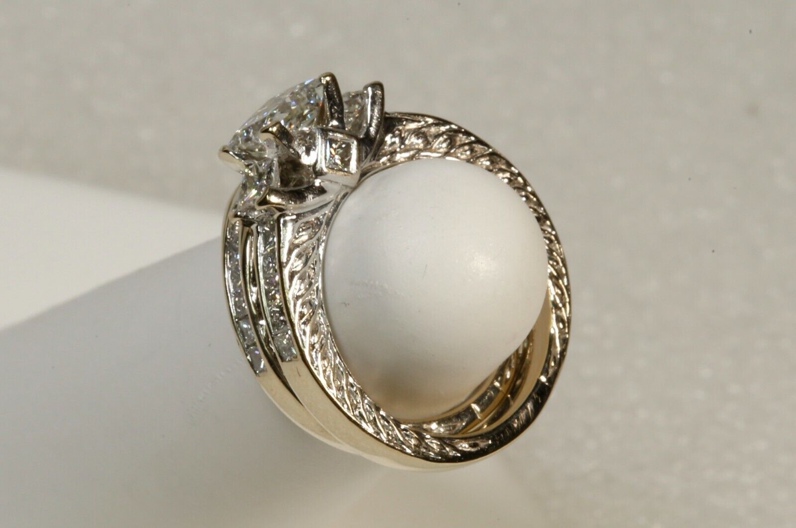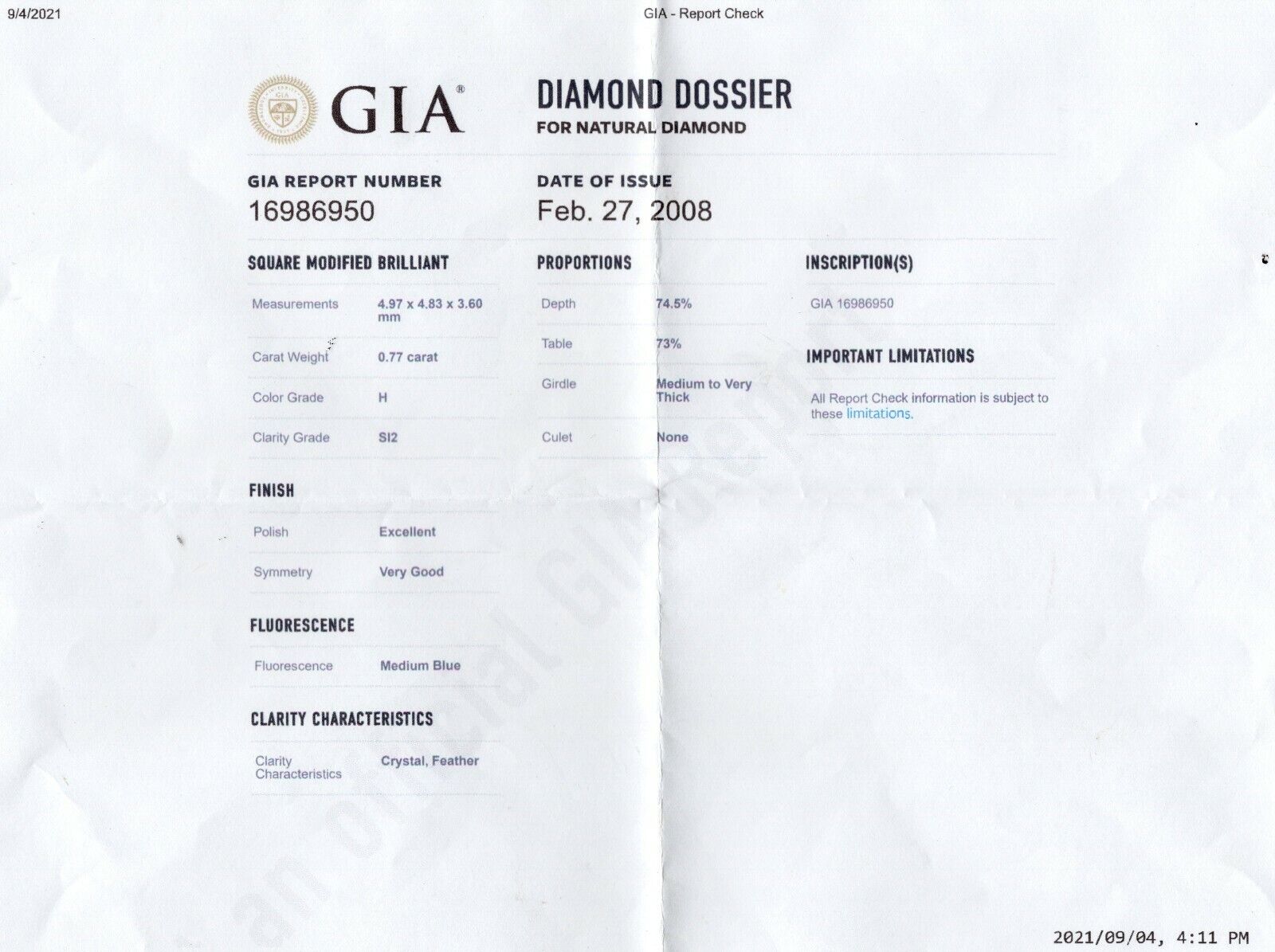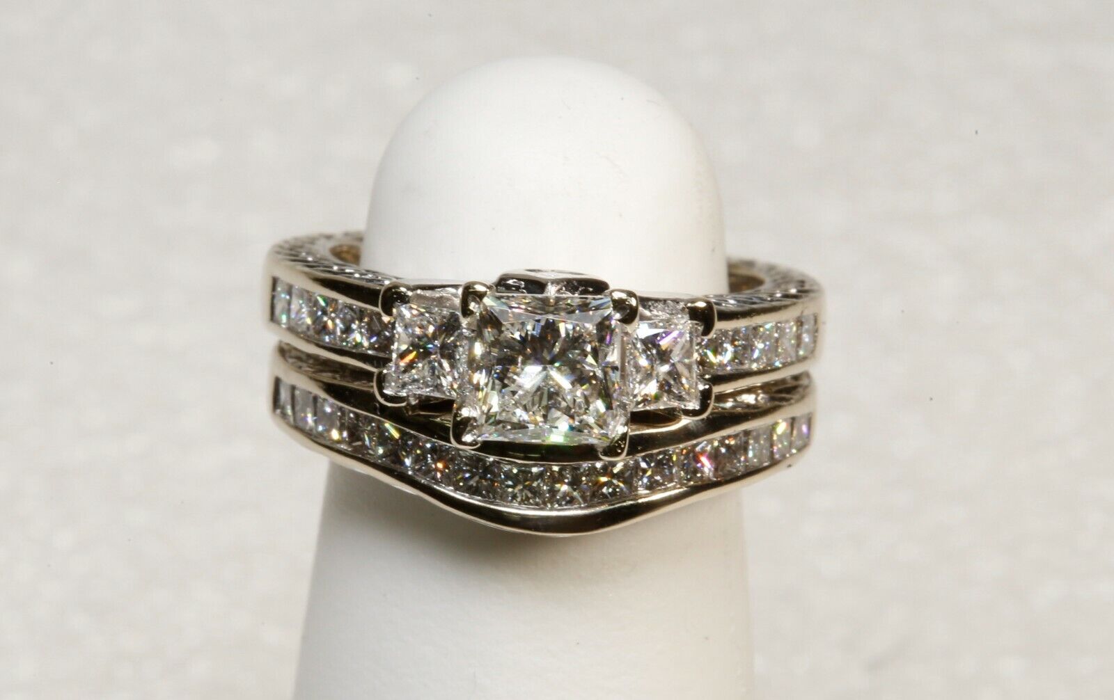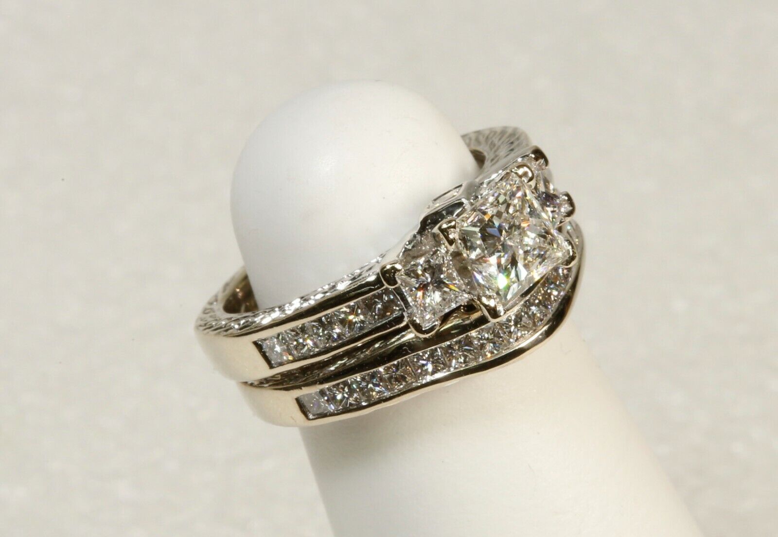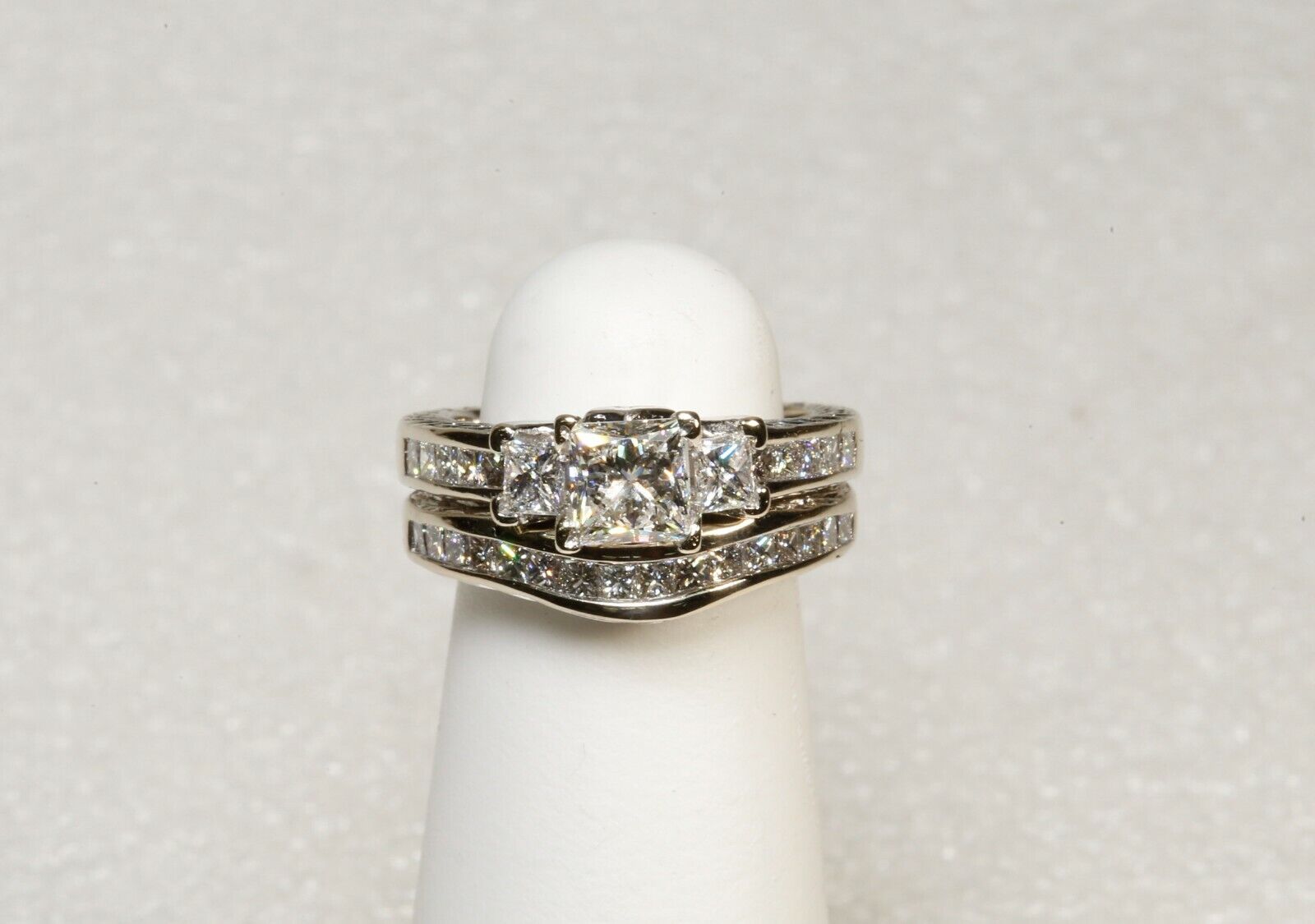 Engagement Ring Diamonds: Center- (see GIA Report Copy) .77 Princess, H Color, SI2 Clarity. Side Diamonds- (2) Princess Cute, G Colors, VS2 Clarity, 2.92mm each, estimate 0.31 Carat TW. (12) Princess Cuts in Channels, 2 Surprise Cuts, G-H Colors, VS1-VS2 Clarity, 1.5 – 1.7 mm each, estimates 0.42 Carat TW. Overall – 1.50 Carat TW (.73 Carats TW + .77 Center Diamond)
