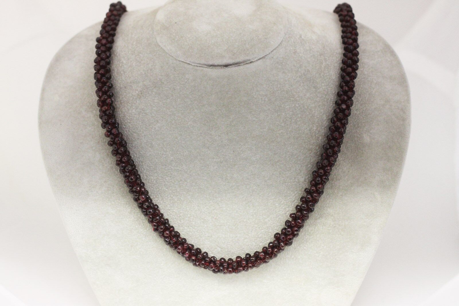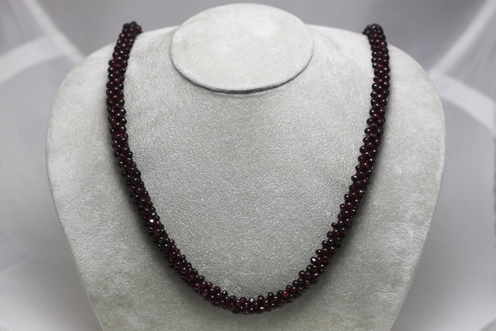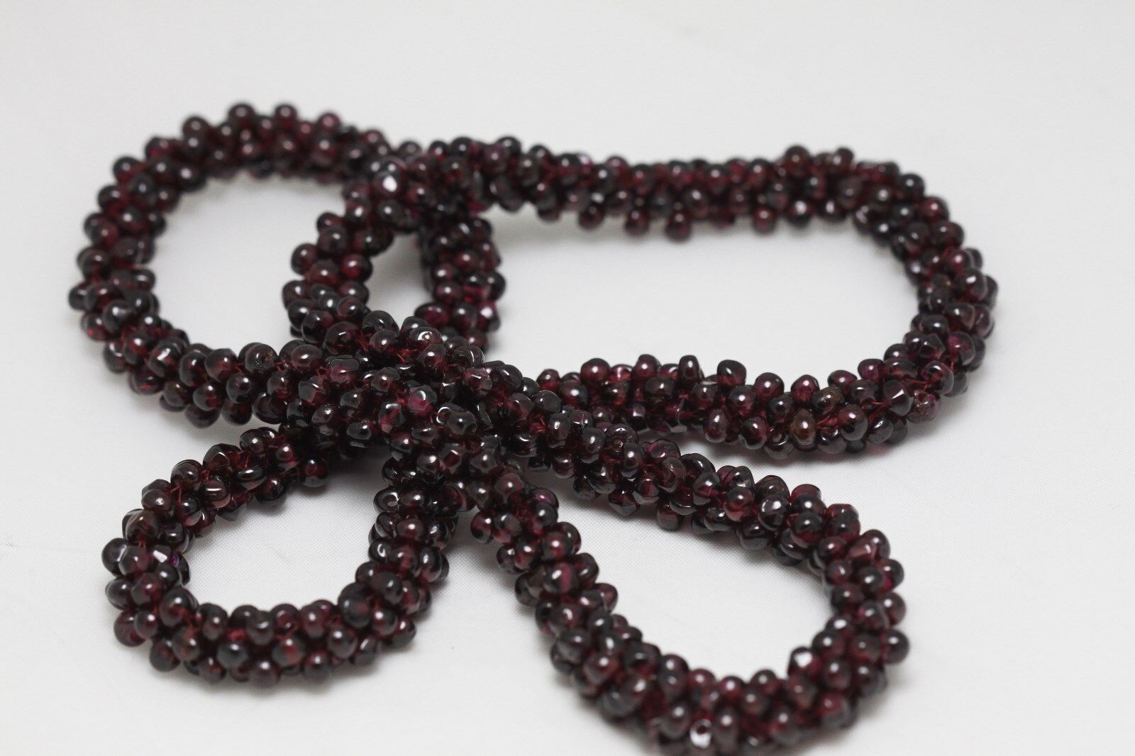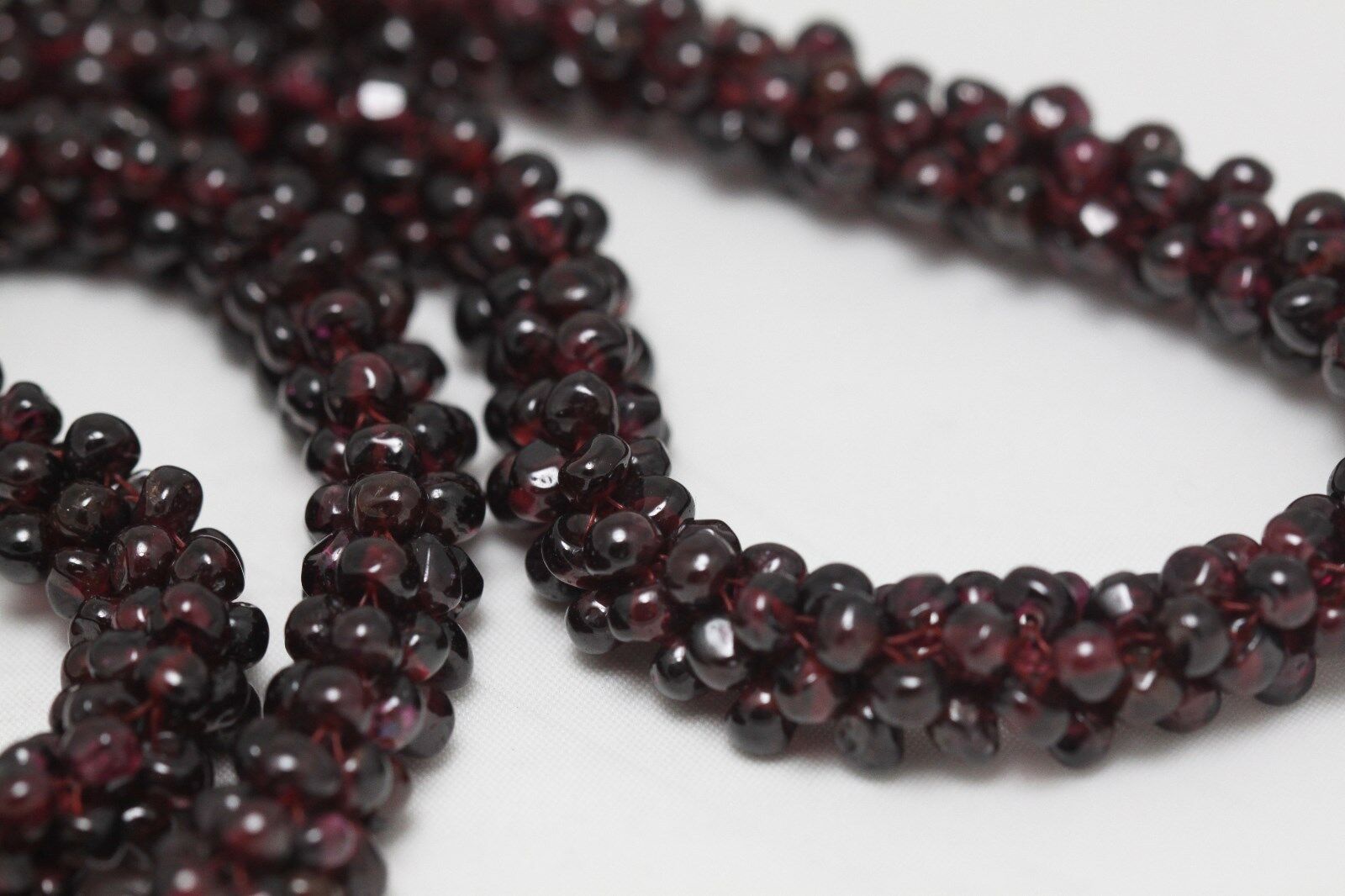 A genuine bohemian style woven 27" long, 10mm in width necklace that is without a closure, thus making it endless. Tested by refractive index to be genuine rhodolite garnets each averaging 3.5mm to 4.0mm in diameters with an estimate total weight of 467 carats that have a deep wine red color almost identical to pomegranate seeds. This necklace is in wonderful condition and is ready to be worn now.