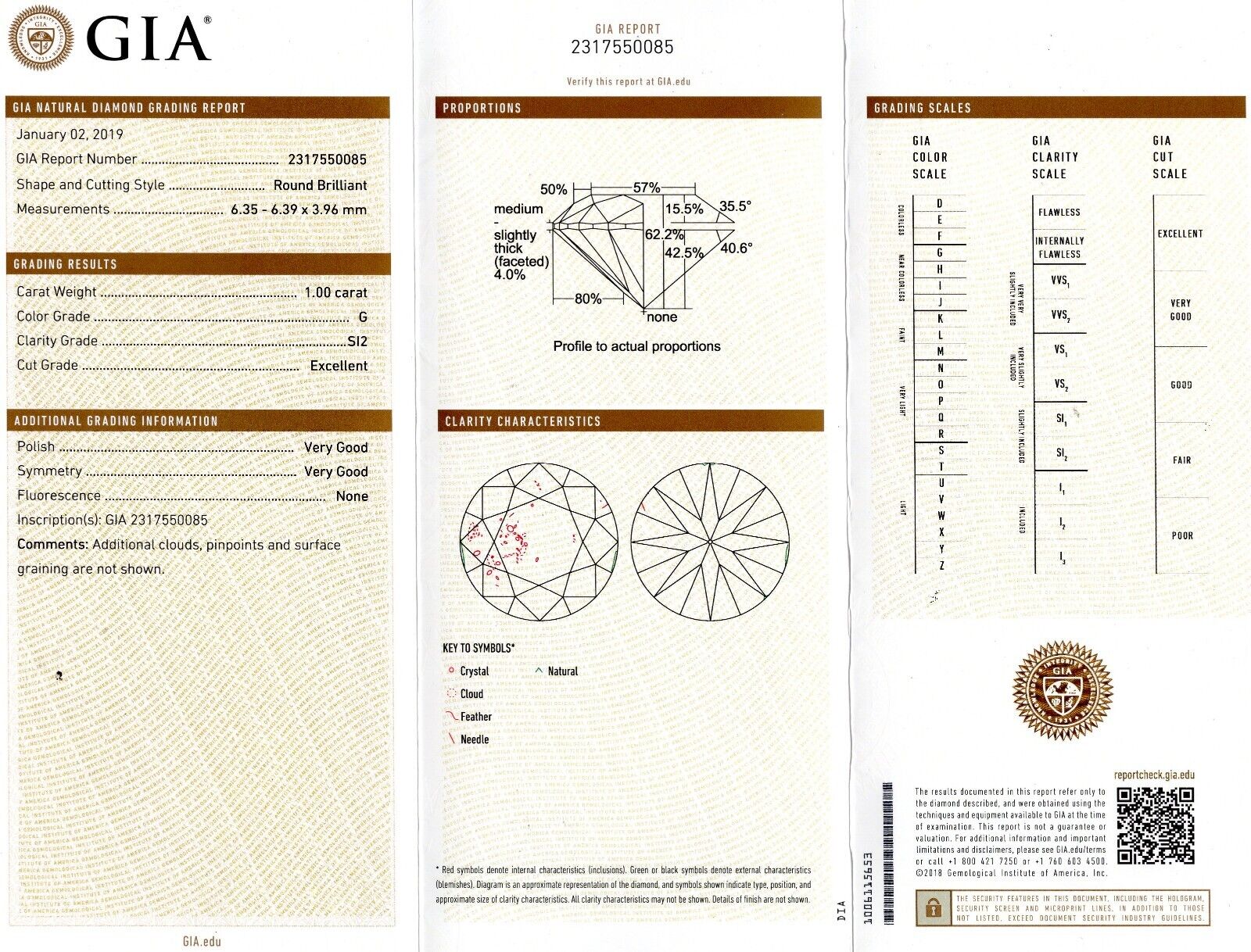 Center Diamond: 1.00 Round Brilliant, Exc. Cut, G Color, SI2 Clarity (faces 100% eye-clean and very white, please see report)